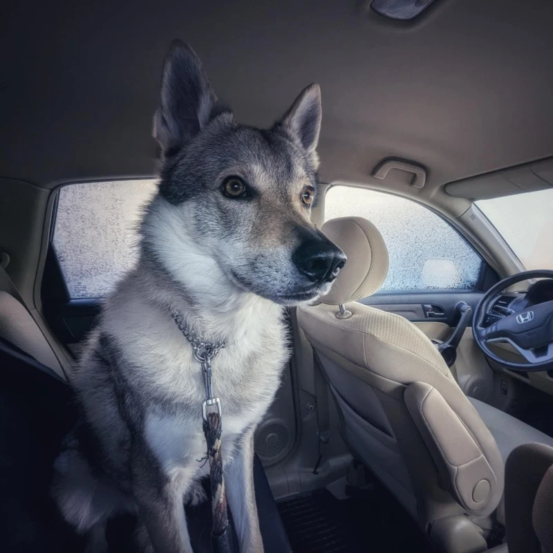 Panický strach se podařilo odbourat postupně, po malých krůčcích. Se zvyšující se jistotou, že auto není nebezpečí, ale místo, odkud se dá pozorovat dění kolem a kde přijde za odměnu dobrá mňamka, kterou jinde než v autě 🐺 Conrí nedostane.